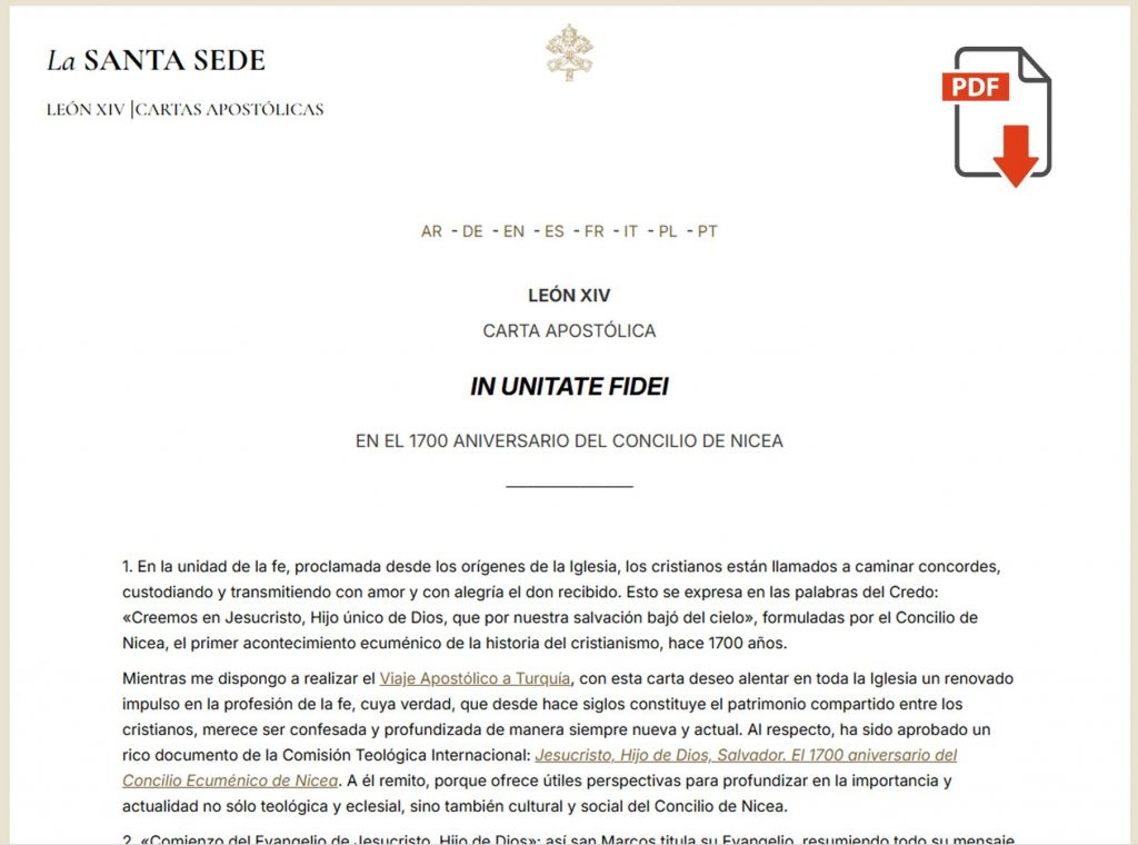 / Última actualización : Anuncio Carta Apostólica IN UNITATE FIDEI Carta Apostólica IN UNITATE FIDEI del Santo Padre León XIV en el 1.700 aniversario del Concilio de Nicea (23 de noviembre de 2025)